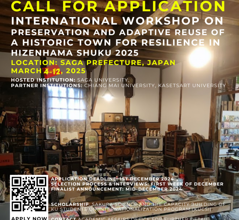 ประกาศรายชื่อนิสิตที่ผ่านการคัดเลือก โครงการประชุมเชิงปฏิบัติการอนุรักษ์คุณค่าสถาปัตยกรรมและสภาพแวดล้อมชุมชนฮิเซน-ฮามะชุคุ ณ เมืองคาชิมะ จังหวัดซากะ ประเทศญี่ปุ่น