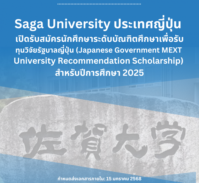 Saga University ประเทศญี่ปุ่นประกาศรับสมัครทุนรัฐบาลญี่ปุ่น (Japanese Government MEXT University Recommendation Scholarship) ประจำปี 2025