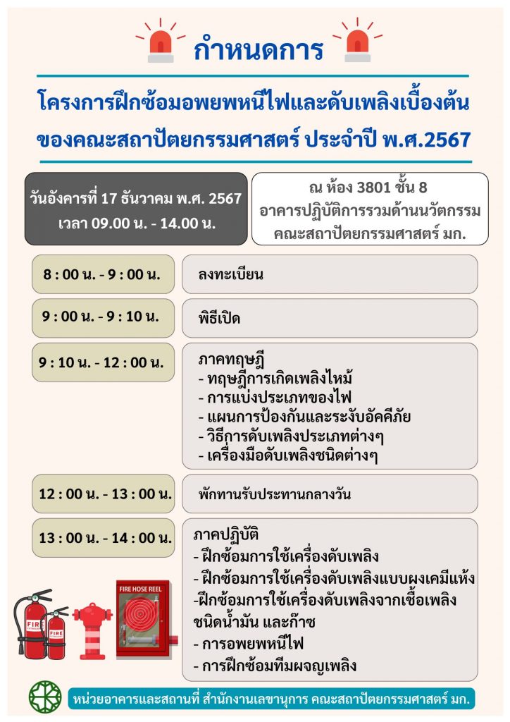 โครงการฝึกซ้อมอพยพหนีไฟและดับเพลิงเบื้องต้น ของคณะสถาปัตยกรรมศาสตร์ ประจำปี พ.ศ. 2567 กำหนดการโครงการฝึกซ้อมอพยพหนีไฟและดับเพลิงเบื้องต้น ของคณะสถาปัตยกรรมศาสตร์ ประจำปี พ.ศ.2567