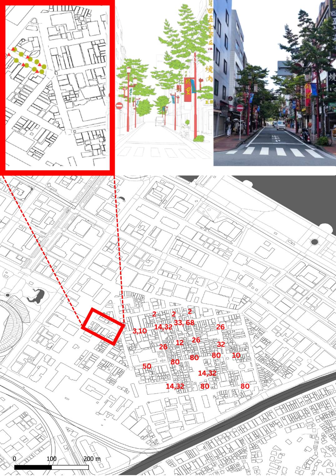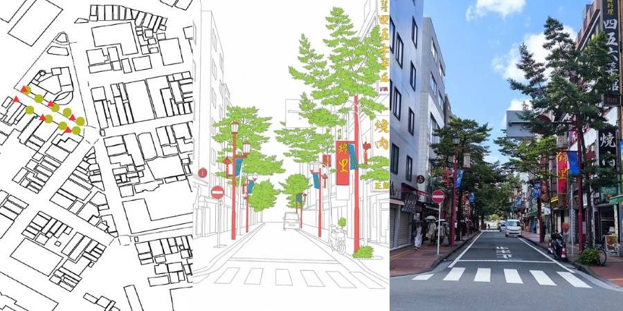 กิจกรรมที่โยโกฮามะเน้นการบันทึก “รายละเอียดเล็กๆ” ที่หล่อหลอมภูมิทัศน์เมืองประวัติศาสตร์ เช่น ป้ายร้านค้า โคมไฟ ต้นไม้ กิจกรรมของผู้คน และการใช้พื้นที่ถนน ข้อมูลถูกทำแผนที่ด้วยสัญลักษณ์ วงกลม ลูกศร และตัวเลข พร้อมสร้างคำอธิบายสัญลักษณ์ (Legend) เพื่อให้เข้าใจการกระจายตัวของกิจกรรม จากนั้นนักศึกษาเลือกมุมถนนที่น่าสนใจ ทำการวาดเส้น (Line Drawing) หรือลงรอยเส้นดิจิทัลจากภาพถ่าย โดยเน้นองค์ประกอบบางอย่างด้วยสี เช่น ป้ายโฆษณา โคมไฟ หรือต้นไม้ เพื่อสื่อสารความสำคัญ ก่อนนำแผนที่และภาพวาดมาจัดวางร่วมกัน เชื่อมโยงตำแหน่งจริงกับภาพรายละเอียดที่แสดงให้เห็นลักษณะเฉพาะของพื้นที่ ผลลัพธ์ชี้ให้เห็นว่าเอกลักษณ์ของไชน่าทาวน์ไม่ได้เกิดจากซุ้มประตูหรือแลนด์มาร์กใหญ่เท่านั้น แต่เกิดจากองค์ประกอบเล็กๆ อย่างป้ายร้าน ต้นไม้ การเคลื่อนไหวของผู้คน และกิจกรรมประจำวันซึ่งร่วมกันสร้างคุณค่าทางวัฒนธรรม