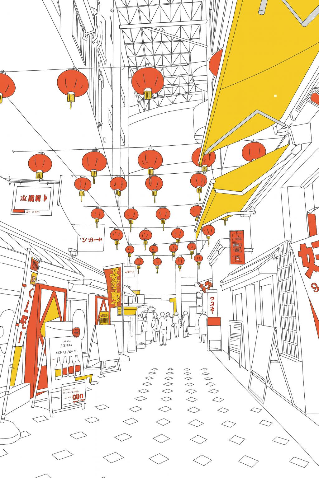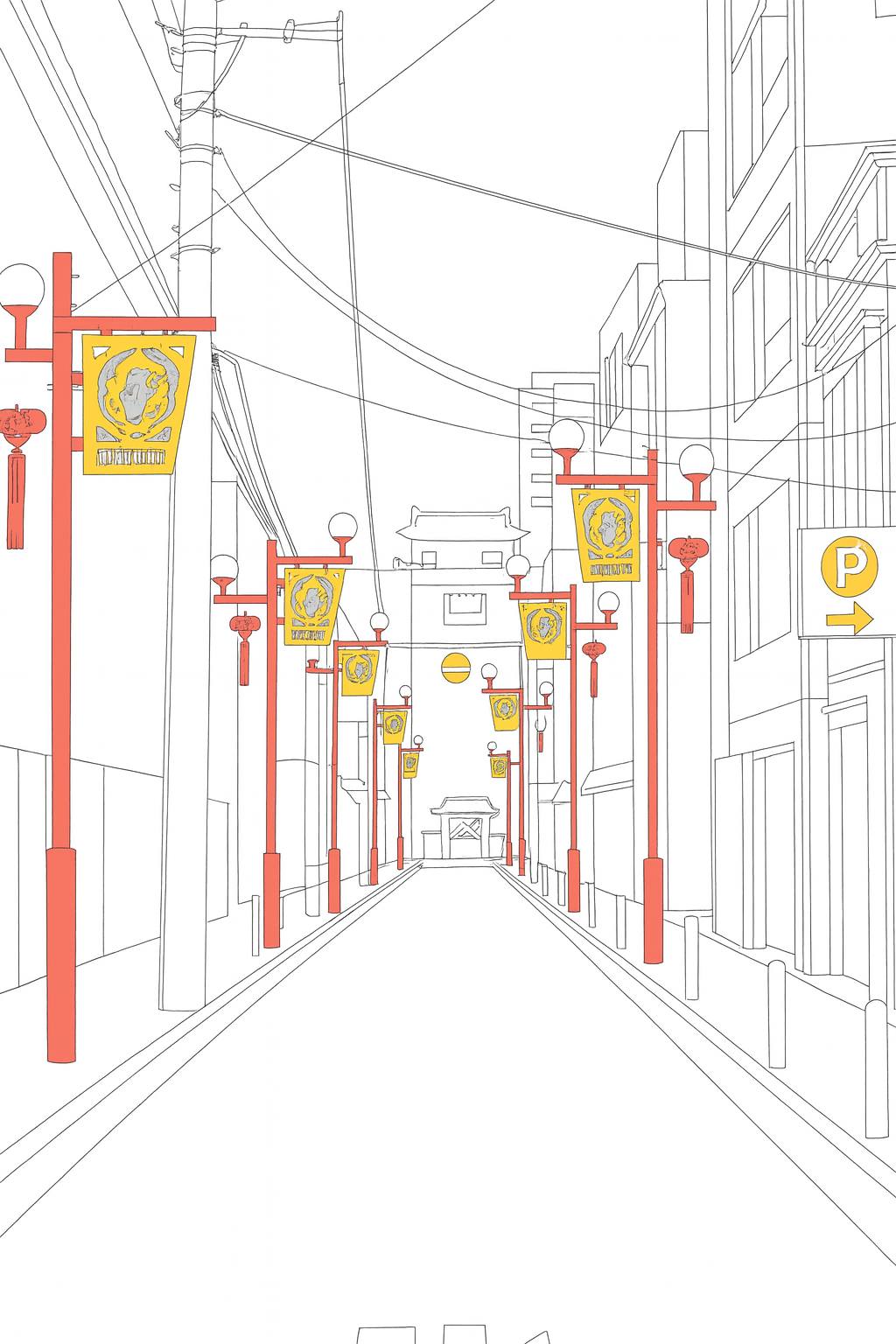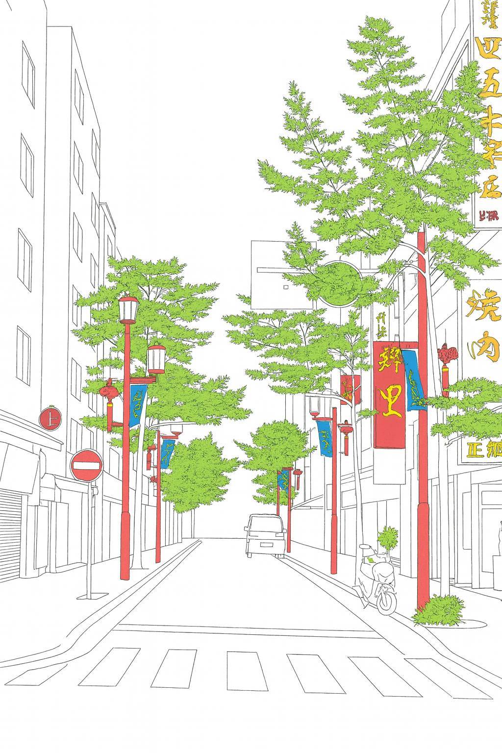 Students then produced line drawings and digital tracings from photographs of selected street corners. These drawings emphasized the architectural backdrop and the fine-grain features that animate the streetscape, such as banners, decorative lamps, and tree lines. Selective use of color highlighted chosen elements like shop signs, lanterns, or vegetation, bringing attention to how these details contribute to the cultural atmosphere. When combined with the maps, these drawings allowed viewers to understand both the macro-scale distribution of features and the micro-scale character of individual places.