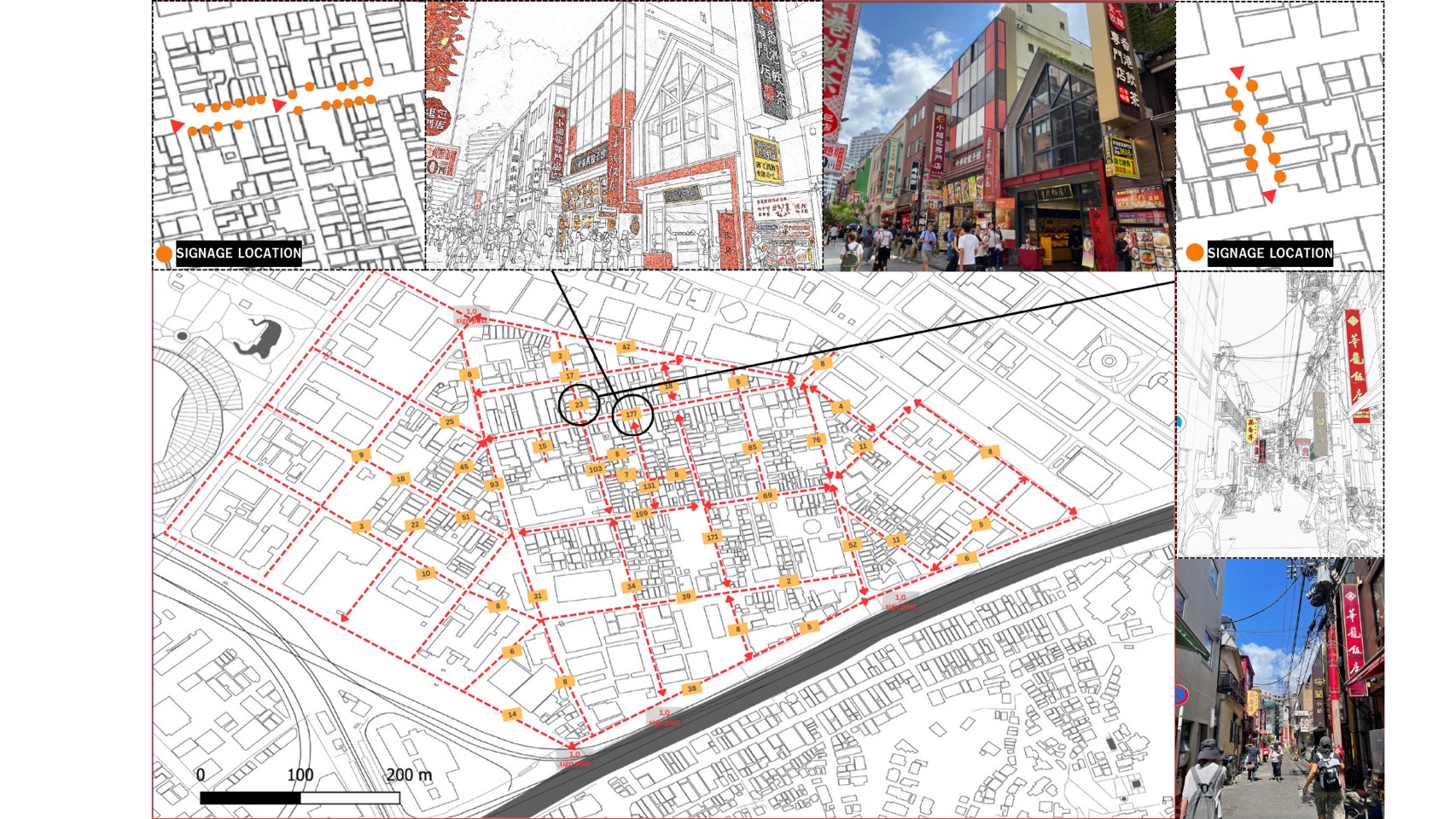 By linking maps and graphics, students created integrated panels that connected mapped survey points with their corresponding street-level representations. This synthesis made visible the relationship between physical distribution and visual-cultural expression. For example, crowd density maps showed hotspots of pedestrian gathering, which were further illustrated by traced drawings of busy alleys, while signboard mapping highlighted the dominance of commercial identity across key routes.