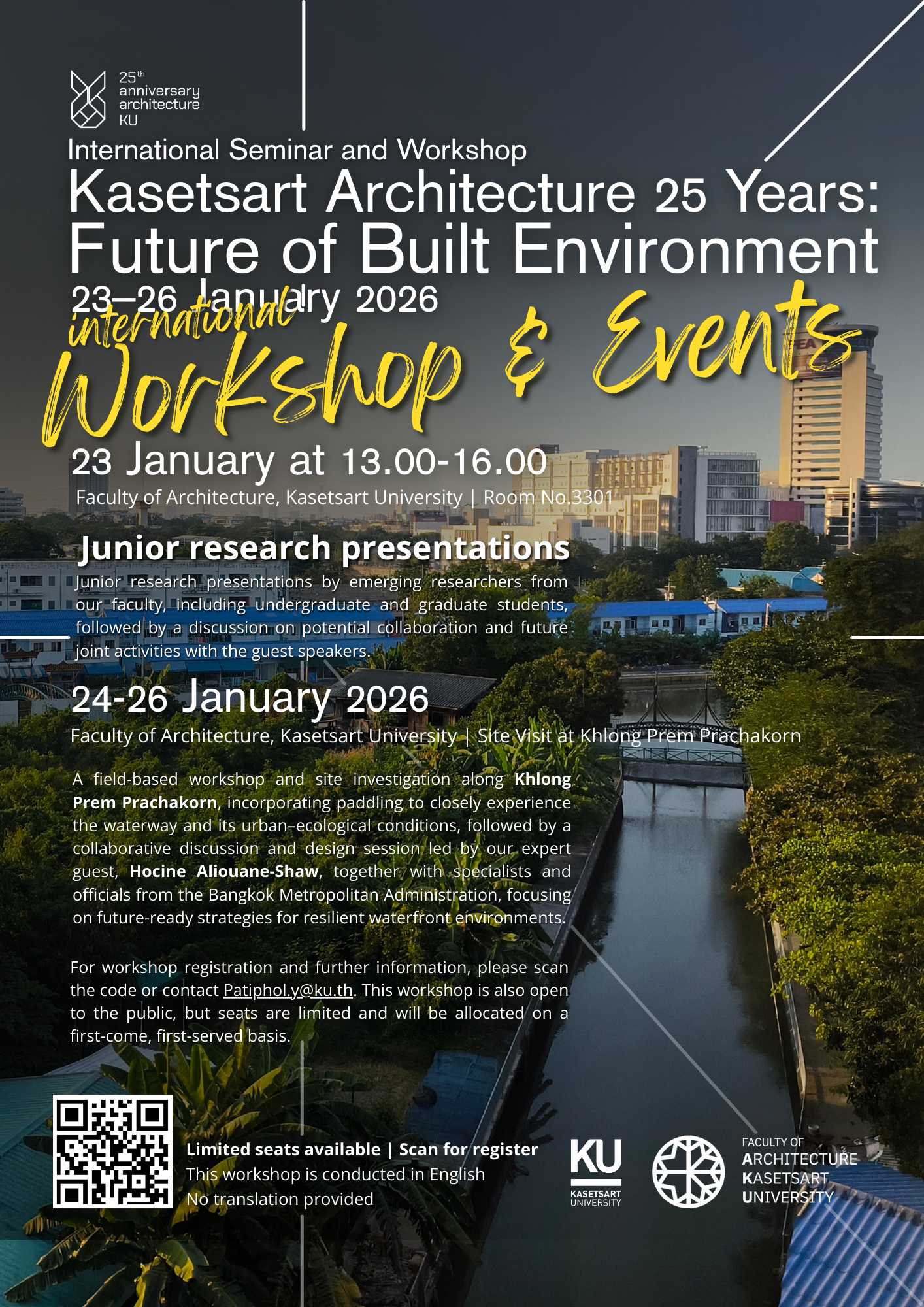 ระหว่างวันที่ 23–26 มกราคม 2569 ร่วมนำเสนอ แลกเปลี่ยนเรียนรู้ และเปิดมุมมองใหม่ในการออกแบบสถาปัตยกรรม เมือง และสภาพแวดล้อมที่ยั่งยืน พบกับผู้เชี่ยวชาญระดับนานาชาติ นักวิจัยรุ่นใหม่ รวมทั้งกิจกรรมเวิร์กช็อปสำรวจพื้นที่คลองเปรมประชากรเพื่อพัฒนาทางเลือกเชิงออกแบบสำหรับอนาคตของเมืองริมน้ำ