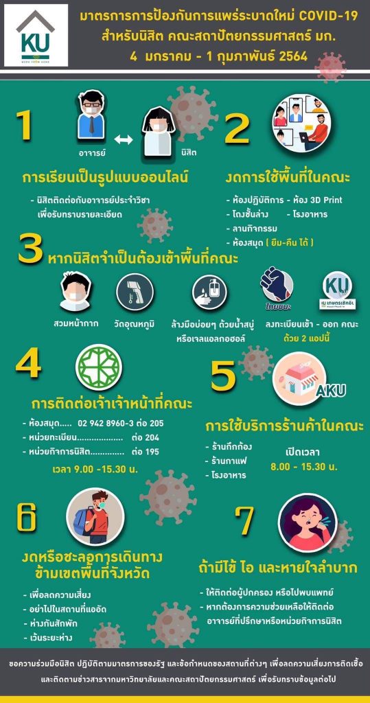 มาตรการป้องกันการแพร่ระบาดใหม่ COVID-19 สำหรับนิสิต คณะสถาปัตยกรรมศาสตร์ มก. มาตรการป้องกันการแพร่ระบาดใหม่ COVID-19 สำหรับนิสิต คณะสถาปัตยกรรมศาสตร์ มก.